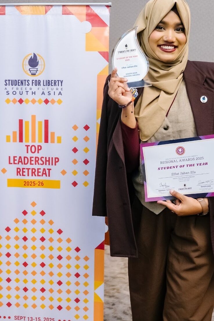 She launched events like the “Empower Bangladesh Social Media Campaign,” “Launchpad SFL Bangladesh,” “Innovate With Liberty,” and “Freedom Pitch,” all of which spread the ideas of liberty — even amidst a revolution and government crackdown. Under her leadership, the Bangladesh network of 60 volunteers used VPNs to lead social media campaigns to inform thousands of people globally about what was happening in their country. And she was instrumental in leading her team to push back against the Quota Reform Movement of 2024.